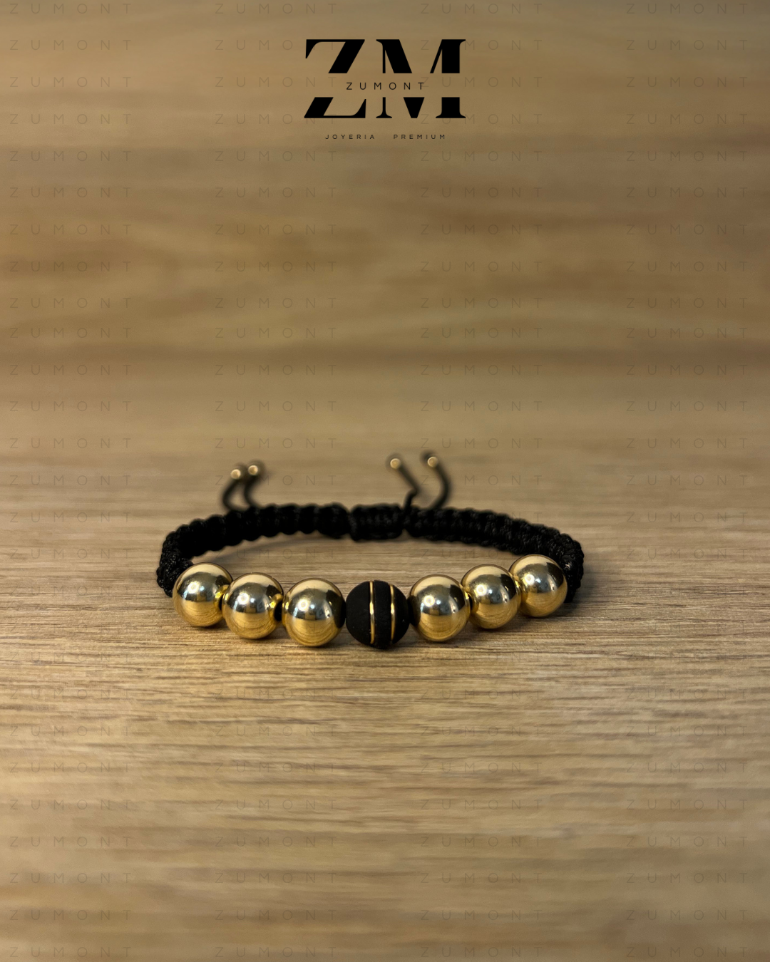 Manilla artesanal en macramé negro con grandes esferas 8mm de oro laminado 18K en acabados brillantes lisos. Elegancia hecha a mano.