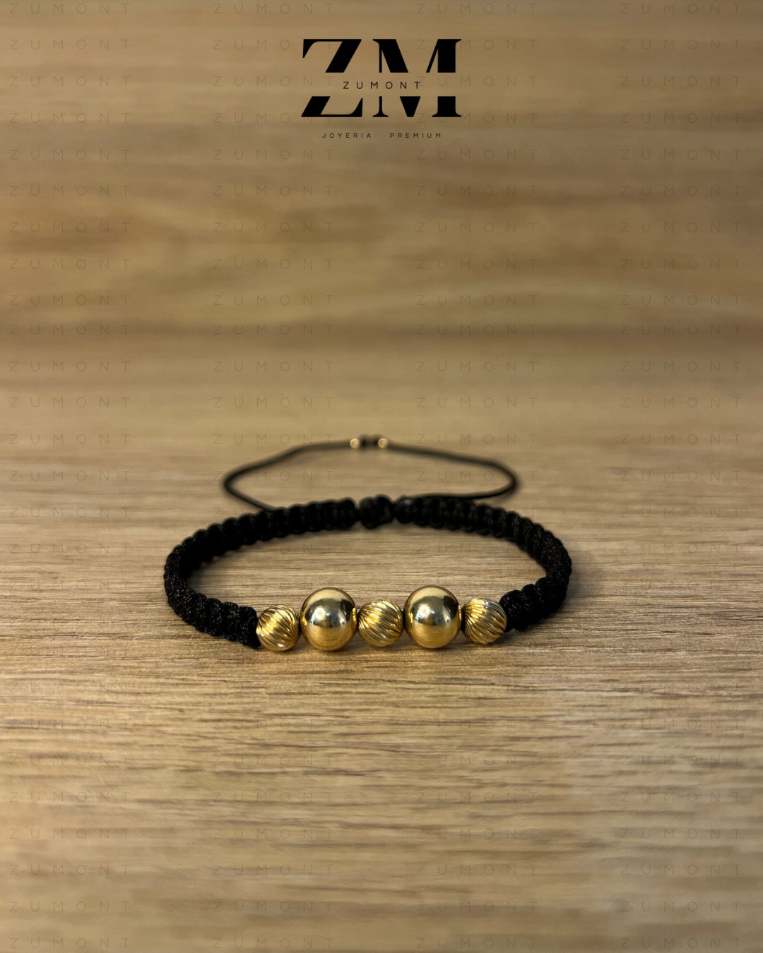 Manilla artesanal en macramé negro con grandes esferas de oro laminado 18K en acabados brillantes lisos y texturizados. Elegancia hecha a mano.