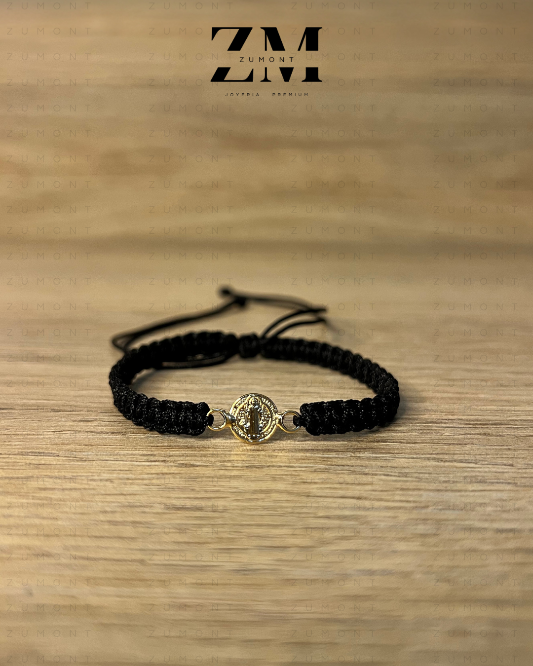 Manilla artesanal en macramé negro con un separador de San Benito en oro laminado 18K con acabados brillantes. Elegancia hecha a mano.